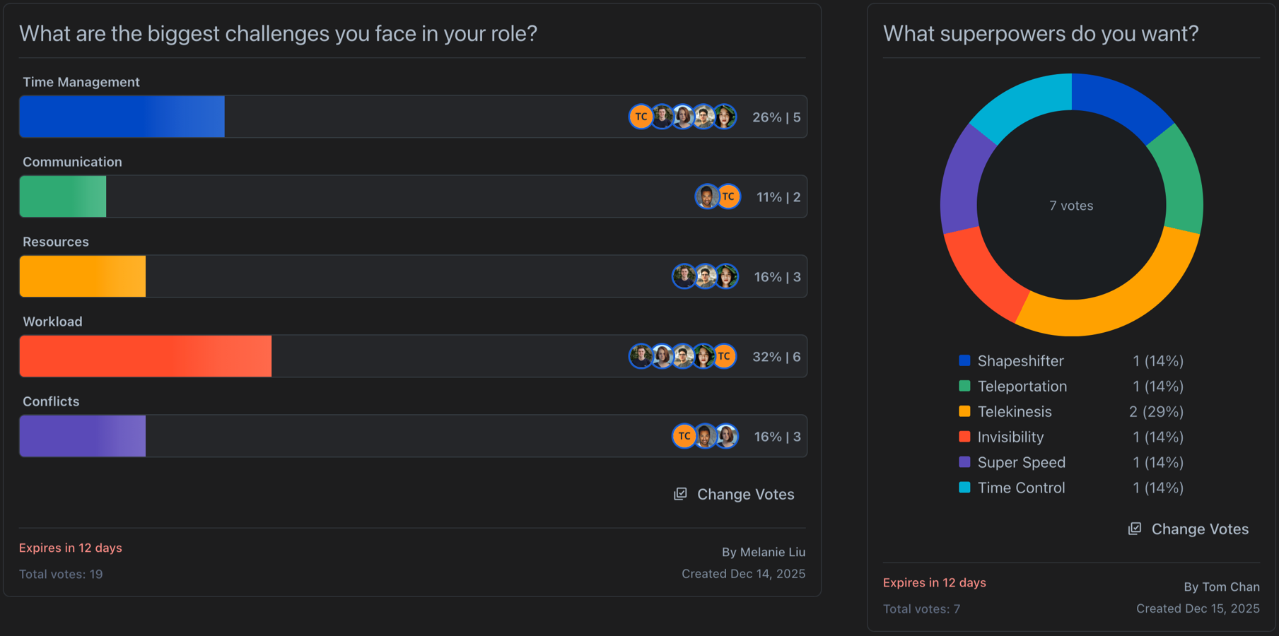 Turn discussion into decisions. Add a poll inline, edit choices directly, and reorder with drag‑and‑drop. Enforced rules (non-empty, unique, min two choices) ensure clarity. Choices with votes lock text (but remain re-orderable) for integrity. Results are clean, accessible, and easy to scan.