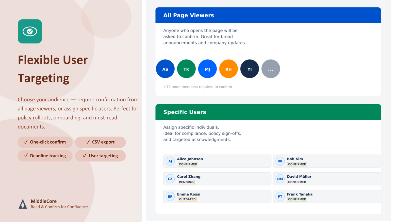 Choose your audience — require confirmation from all page viewers, or assign specific users and groups. Perfect for compliance policies, security guidelines, and onboarding materials.