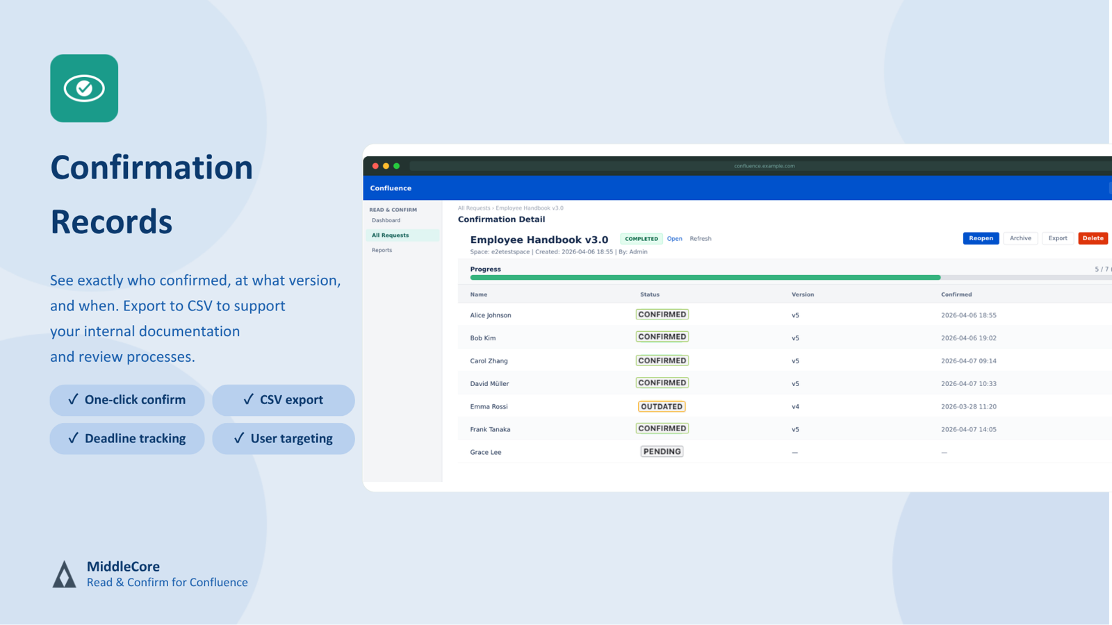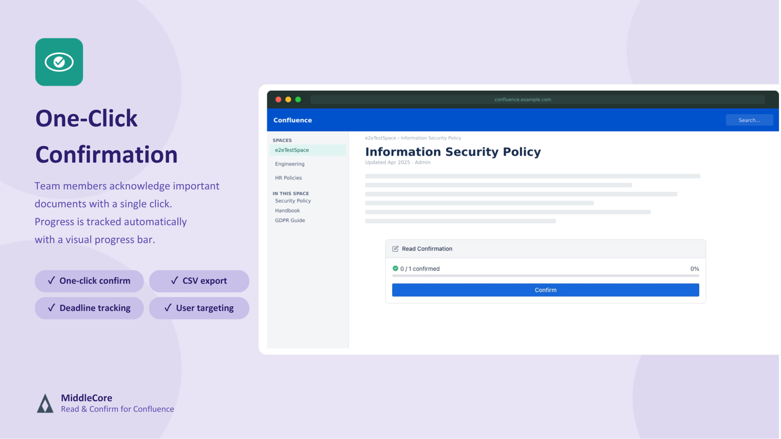 Embed a confirmation button on any Confluence page. Team members acknowledge important documents with a single click, and progress is tracked automatically with a visual progress bar.