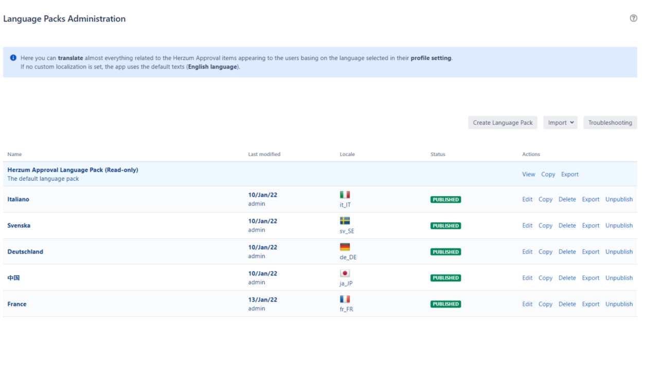 You can translate almost everything related to the Herzum Approval items via a user-friendly administration screen.. The translations will appear to users basing on the language selected in their profile setting.