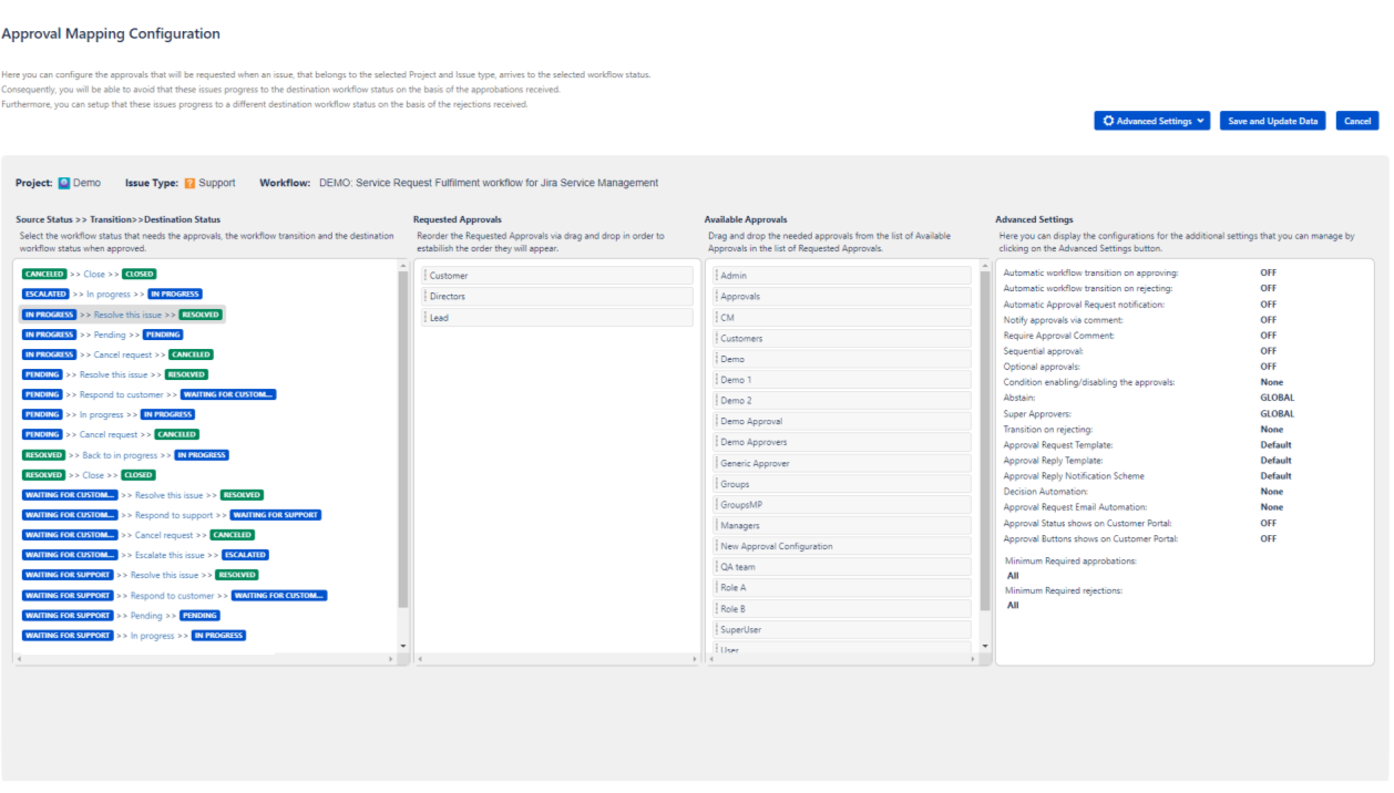 The powerful administration screens make easy to setup: requested approvers, automatic workflow transitioning based on the number of approbations and rejections, automatic approval notification via email and much more.