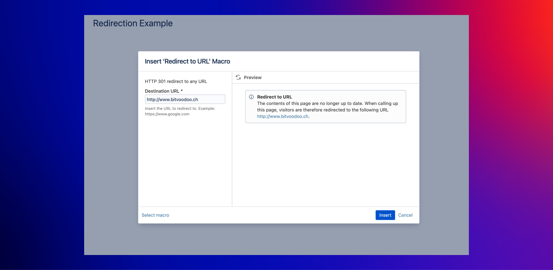 2. Keep the traffic and SEO visibility of pages high when restructuring your Confluence or migrating it (e.g. to the cloud). Add the new "Redirect to URL" macro to redirect pages with an HTTP 301 (permanently moved). You may redirect a page to another Confluence page, blog post, or to an external URL.