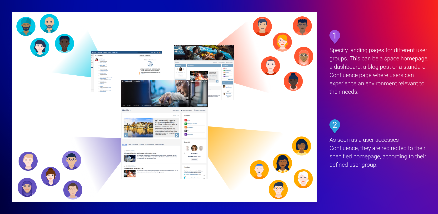 1. Out of the box, Confluence can only have one global homepage. Using our app, administrators can assign unique homepages to specific user groups. User groups include internal users, external users such as clients and partners, and anonymous users. As soon as a user accesses Confluence, they are redirected to their specified homepage, according to their defined user group.