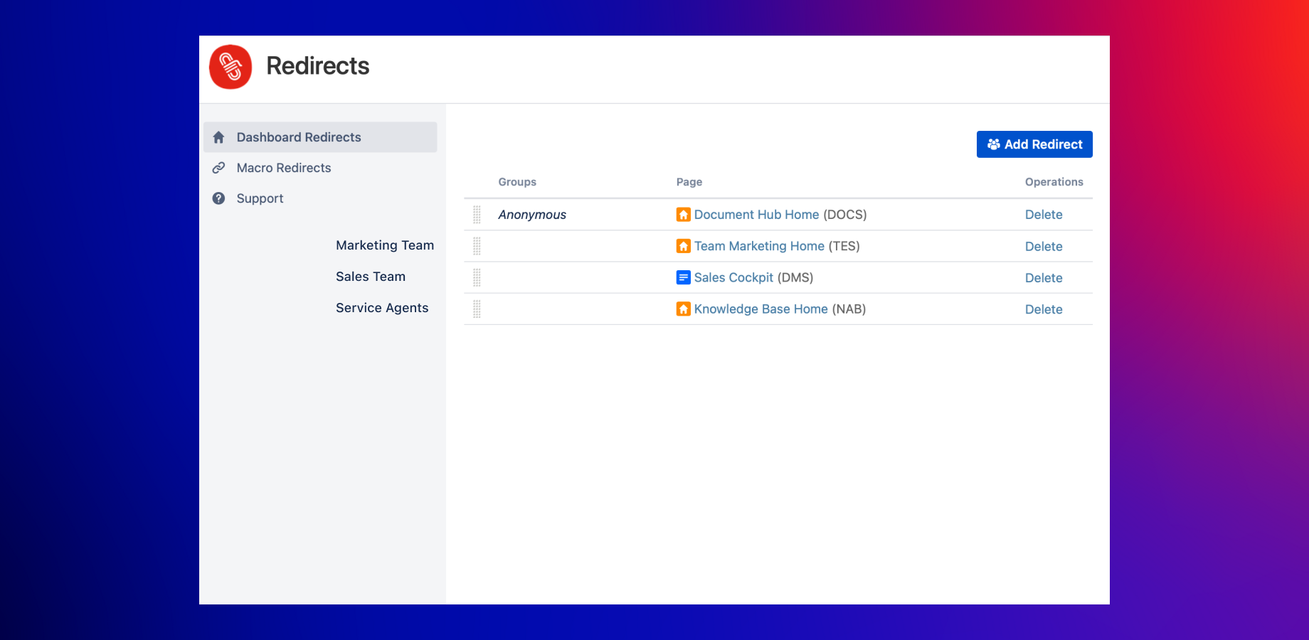 Redirect for Confluence (formerly Homepage Redirect for Confluence) has the following features: