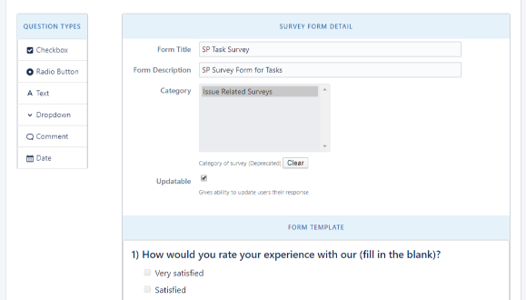 Ability to create survey form easily by using drag and drop capability. Many question types are supported.