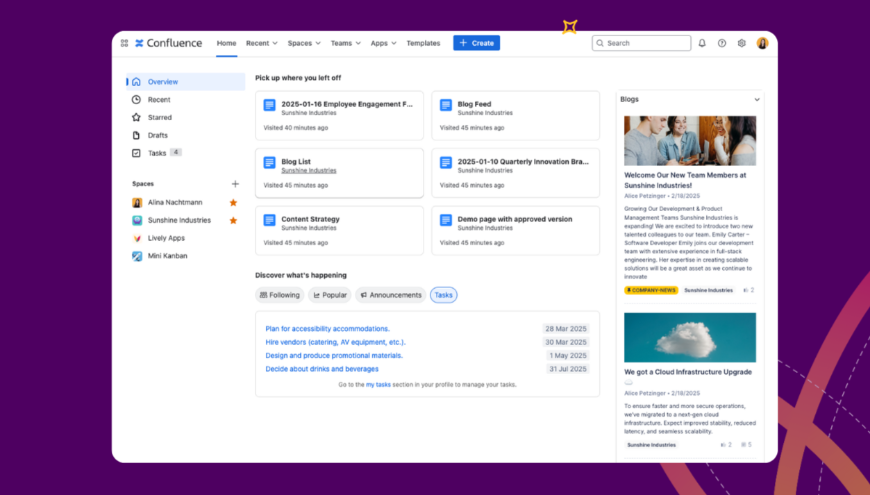 Showcase blogs or pages on your Confluence home for quick access to updates. Use filters by label, author, or space to keep content relevant, timely and engaging—enhancing team interaction and streamlining communication.