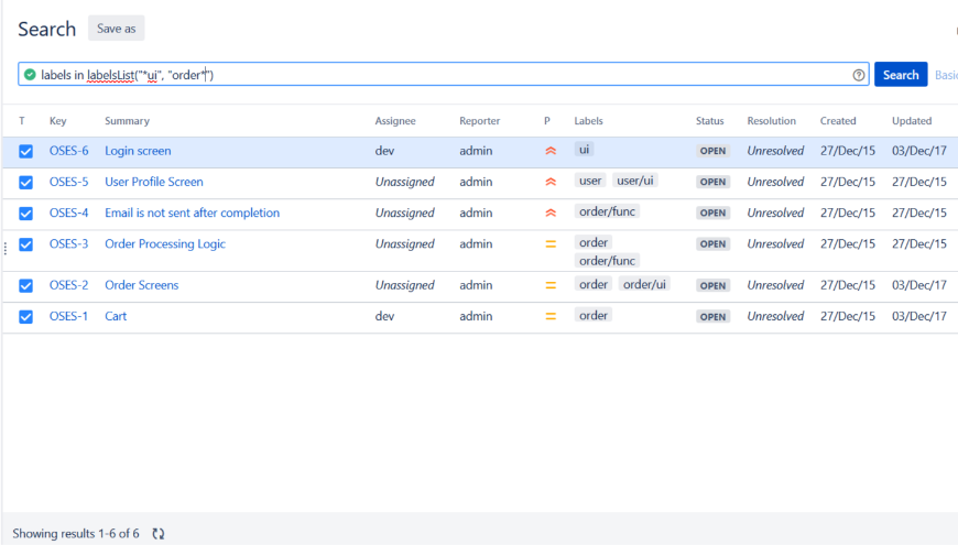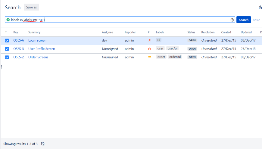 - Specify "*ui*" to get issues with labels "ui/admindashboard", "test/admindashboard/ui" and "ui".