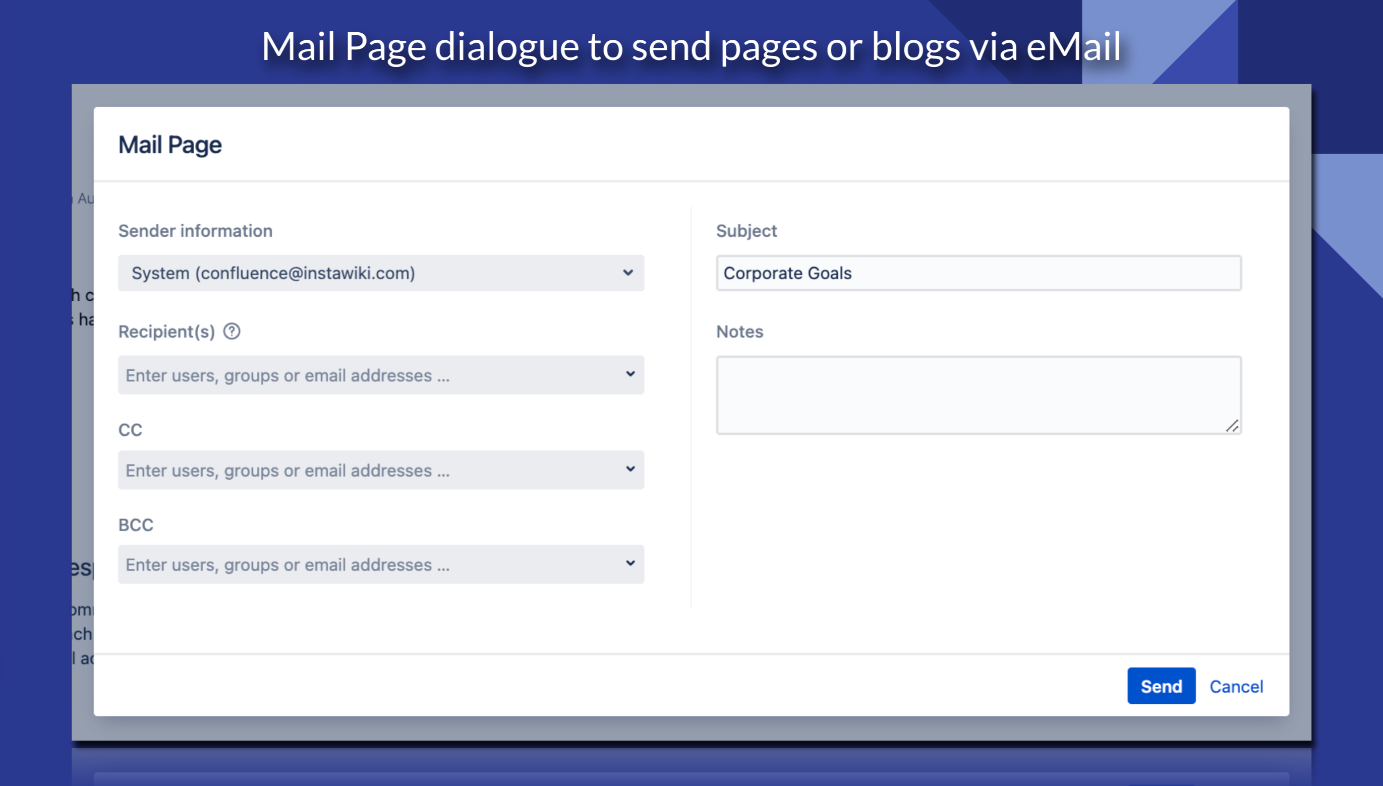 The Mail Page Scheduler & Newsletter App adds a feature to all Confluence pages and blogs, allowing to send the full content via mail.