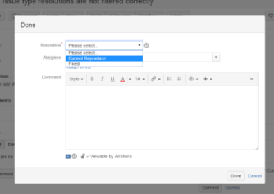 Issue type resolutions work on any screen: create issue, edit issue, workflow resolve screen including Scrum and Kanban boards.