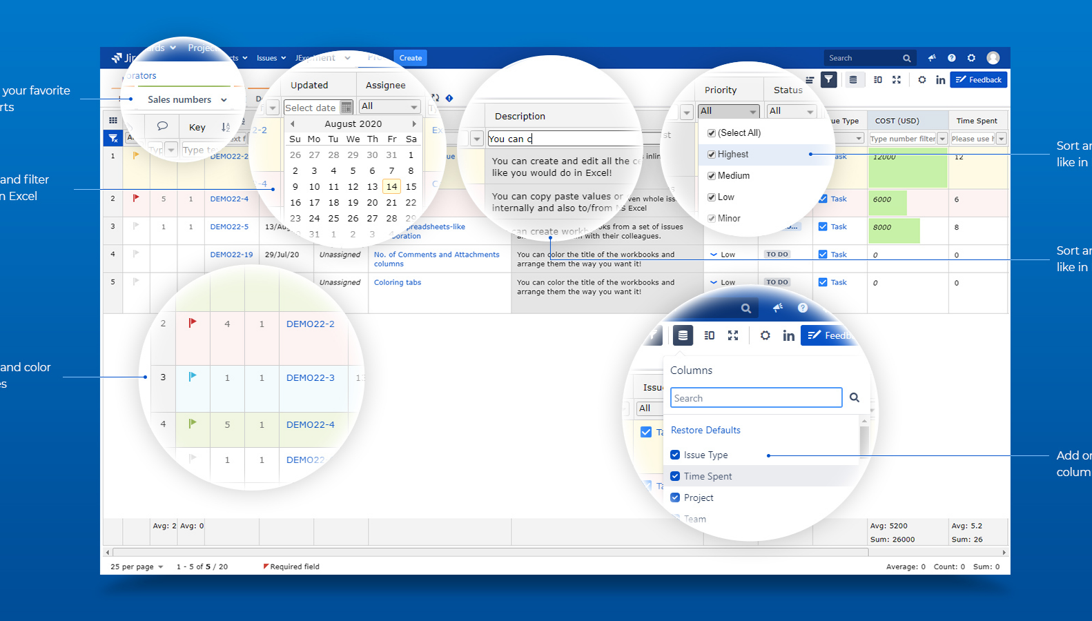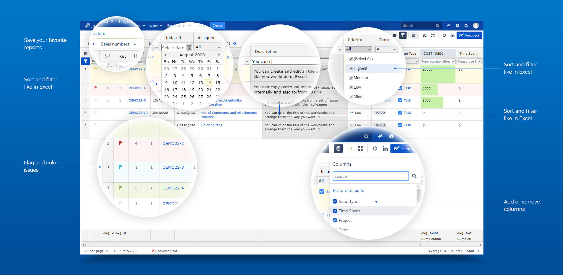 - Create Excel-like views from your Jira projects or filters and share them with collagues