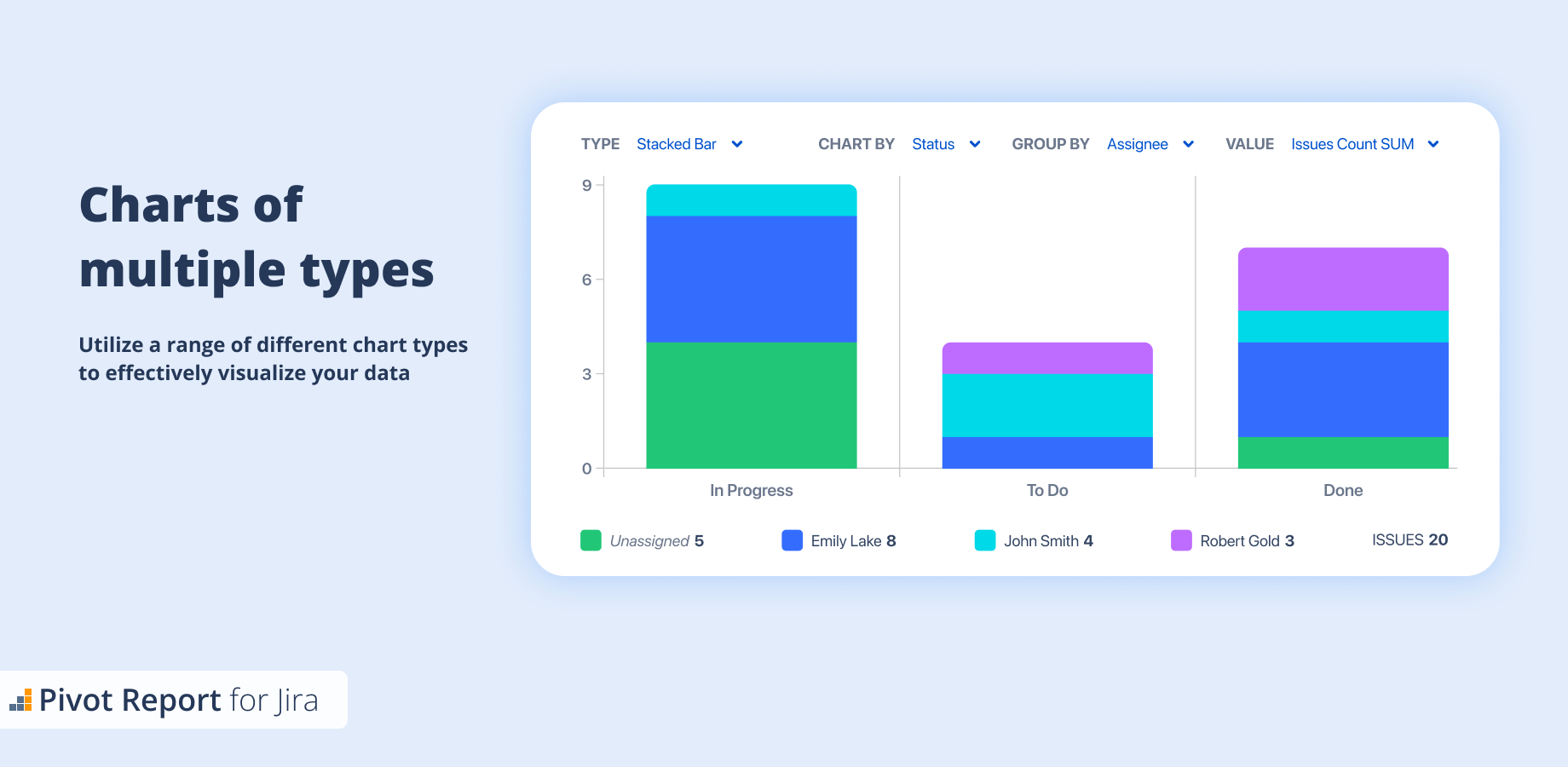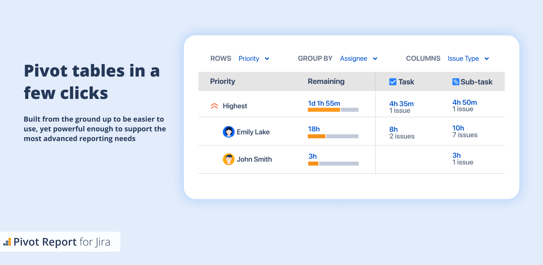 Built from the ground up to be easier to use, yet powerful enough to support the most advanced reporting needs. You can easily represent data from issues as a pivot table with no hassle.
