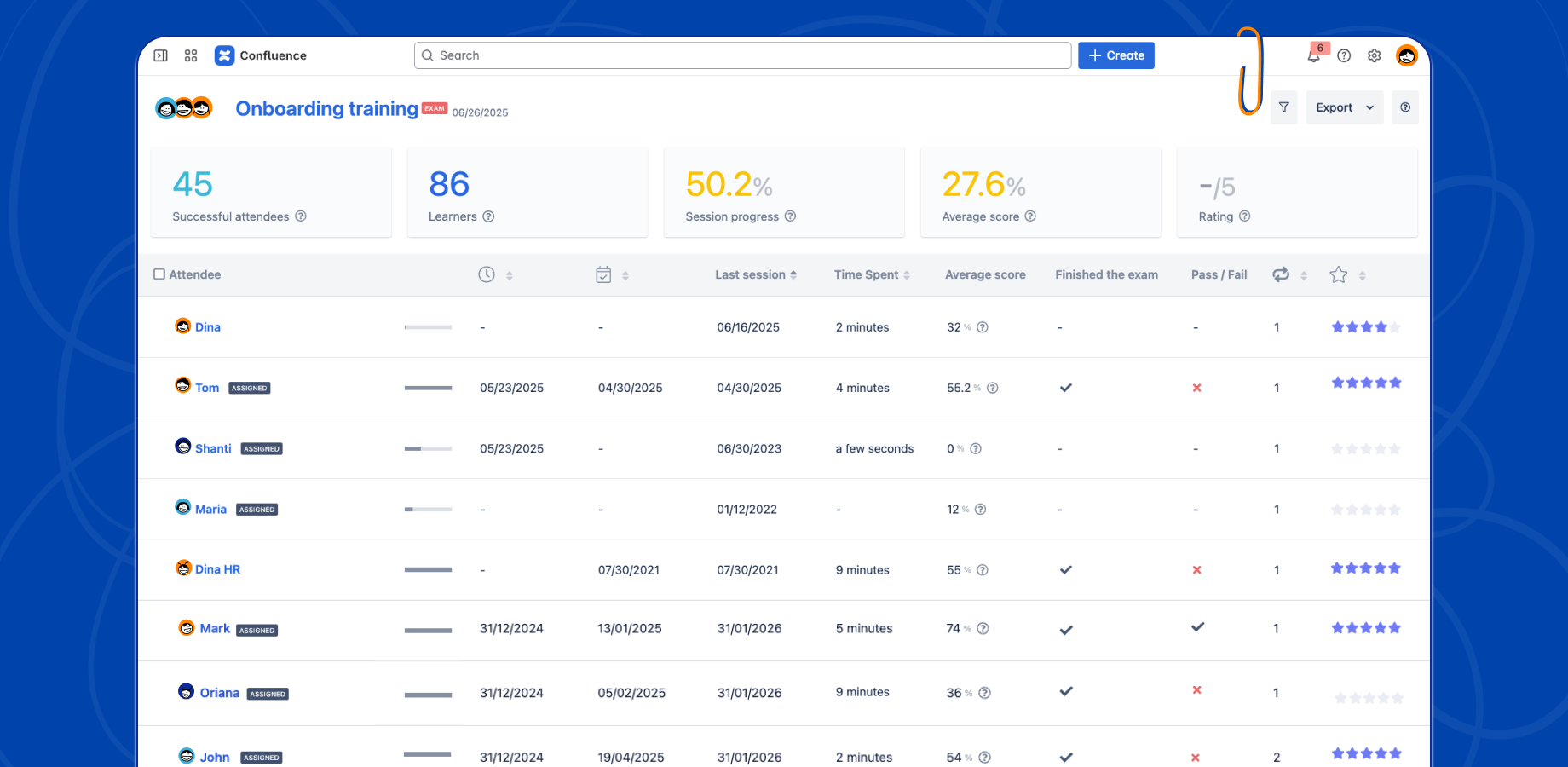 Thanks to an intuitive interface, create your course structure, sections, interactive content, videos, questions. In a few clicks import confluence pages, images, embed interactive web content and import SCORM.