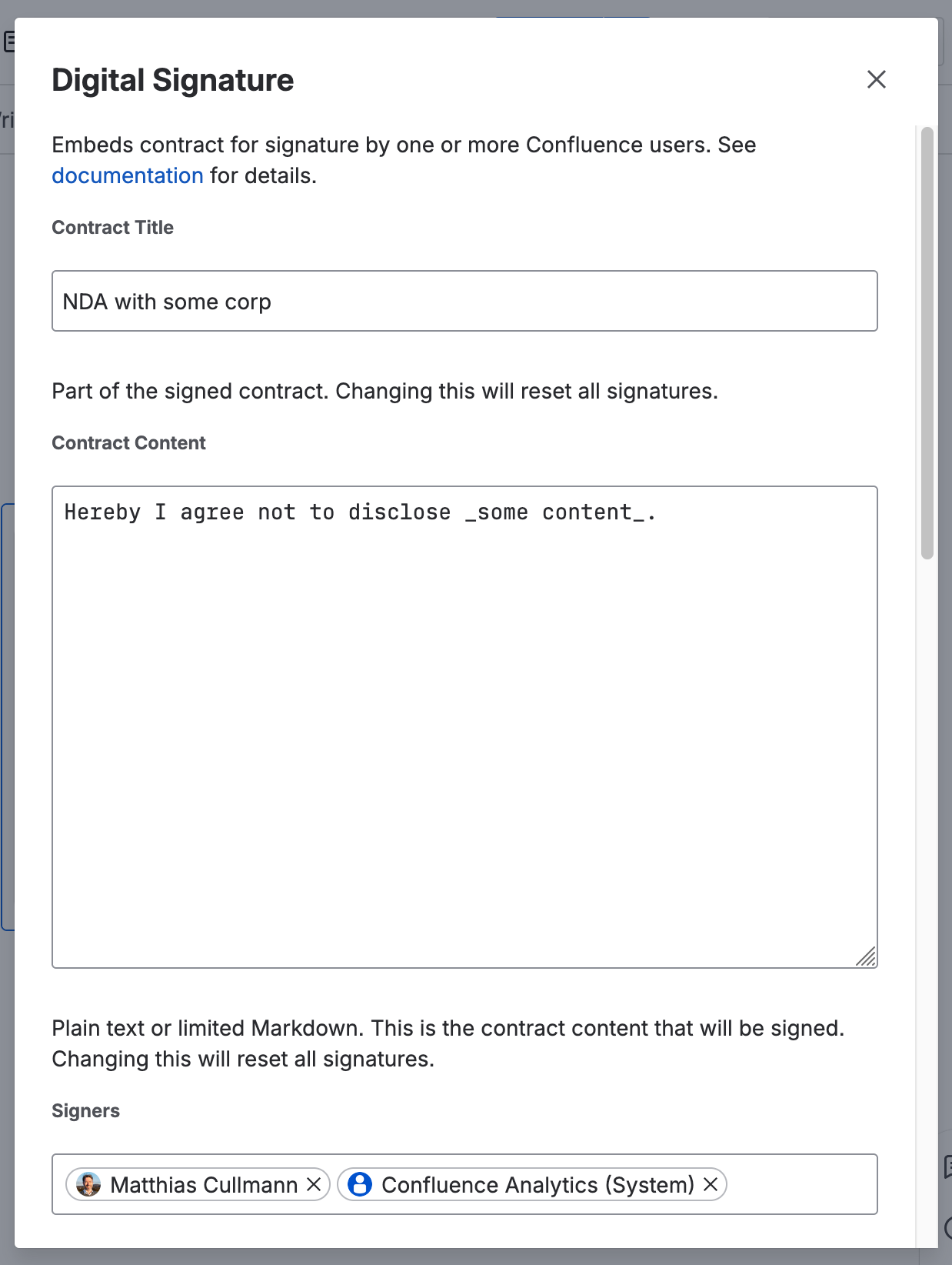 Digital Signature lets teams collect legally-traceable, immutable signatures directly on Confluence pages. Contracts live inside the macro — not in the page body — so signatures only depend on the exact wording of the contract title and content.