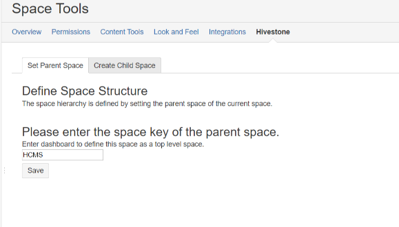 Use Space Admin->Hivestone->Set parent space to provide spacekey of parent space. This parent child relationship can be used to define multilevel space hierarchy. Rest api is also provided to facilitate automation.