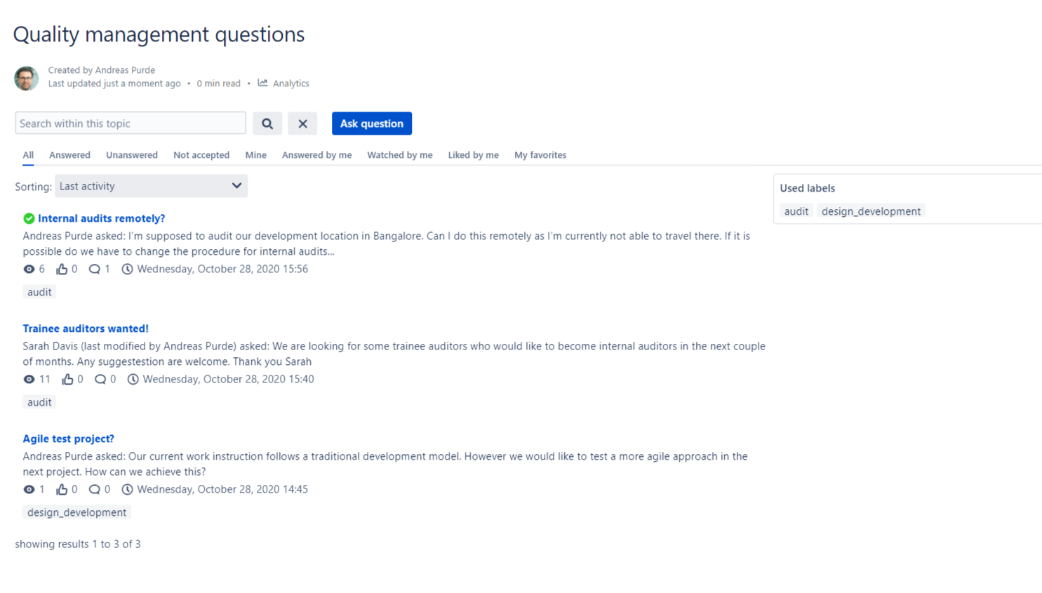 A topic page (for example "Quality management questions") holds the Smart QA questions overview macro. It allows to ask new questions and search, filter and sort existing questions in that topic.
