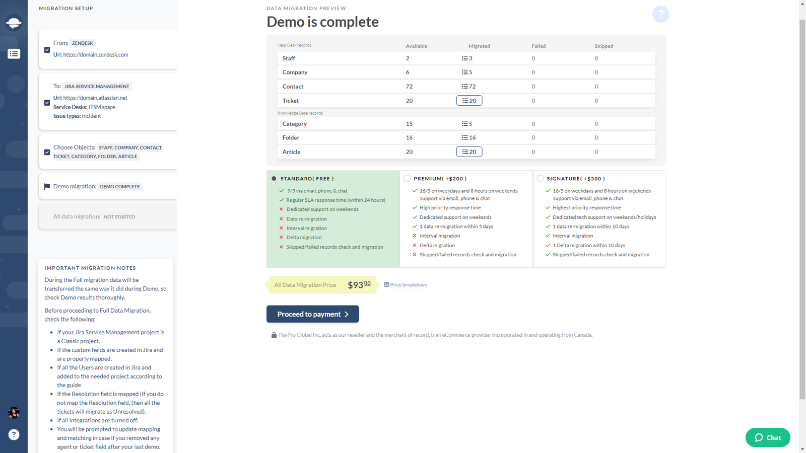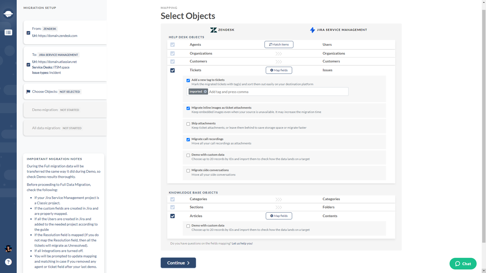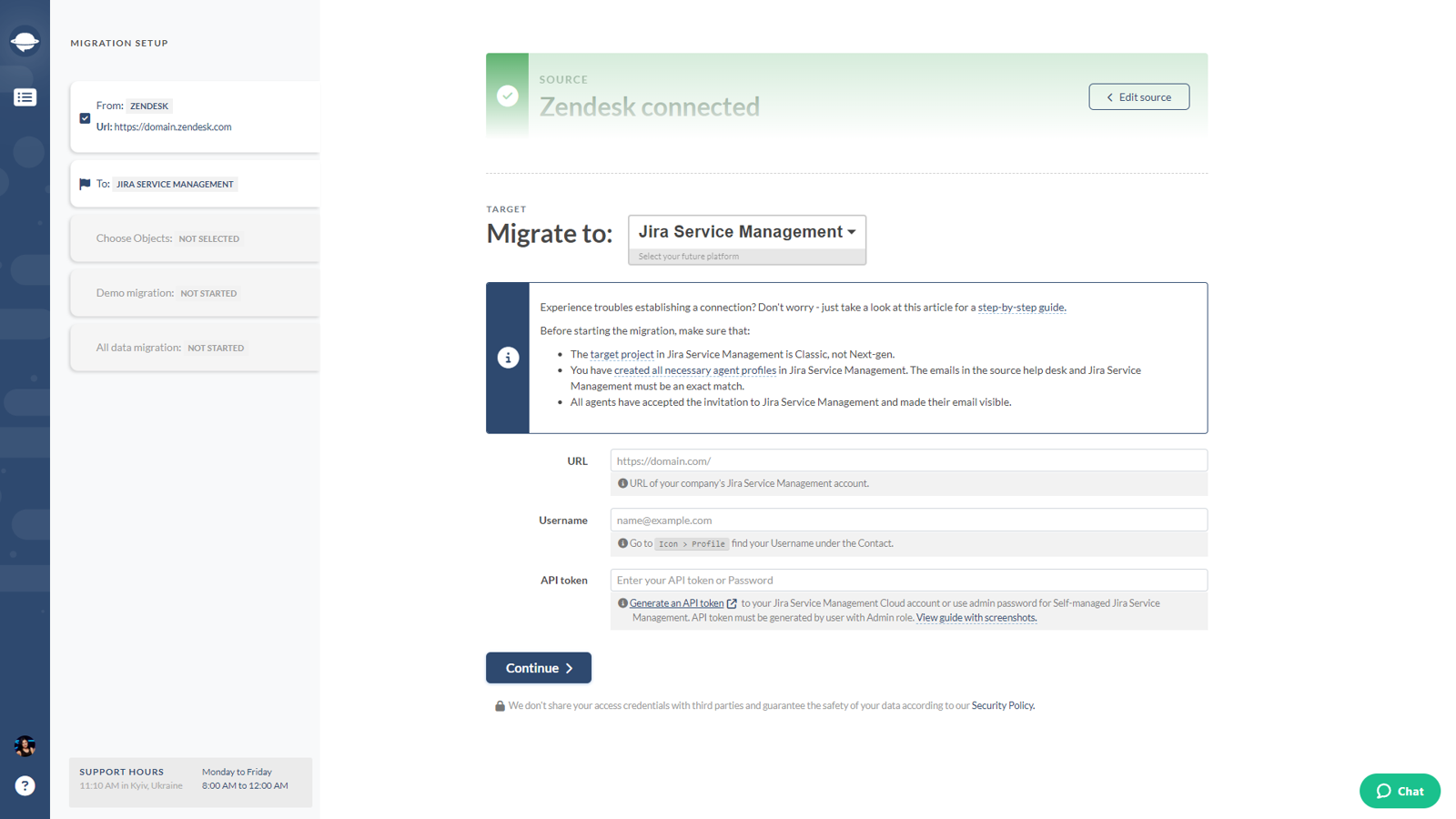 Get started with no upfront payment! Set up a Free Demo to preview Zendesk to Jira migration. Connect your help desk accounts, configure data mapping, and check the accuracy of the initial records transfer.