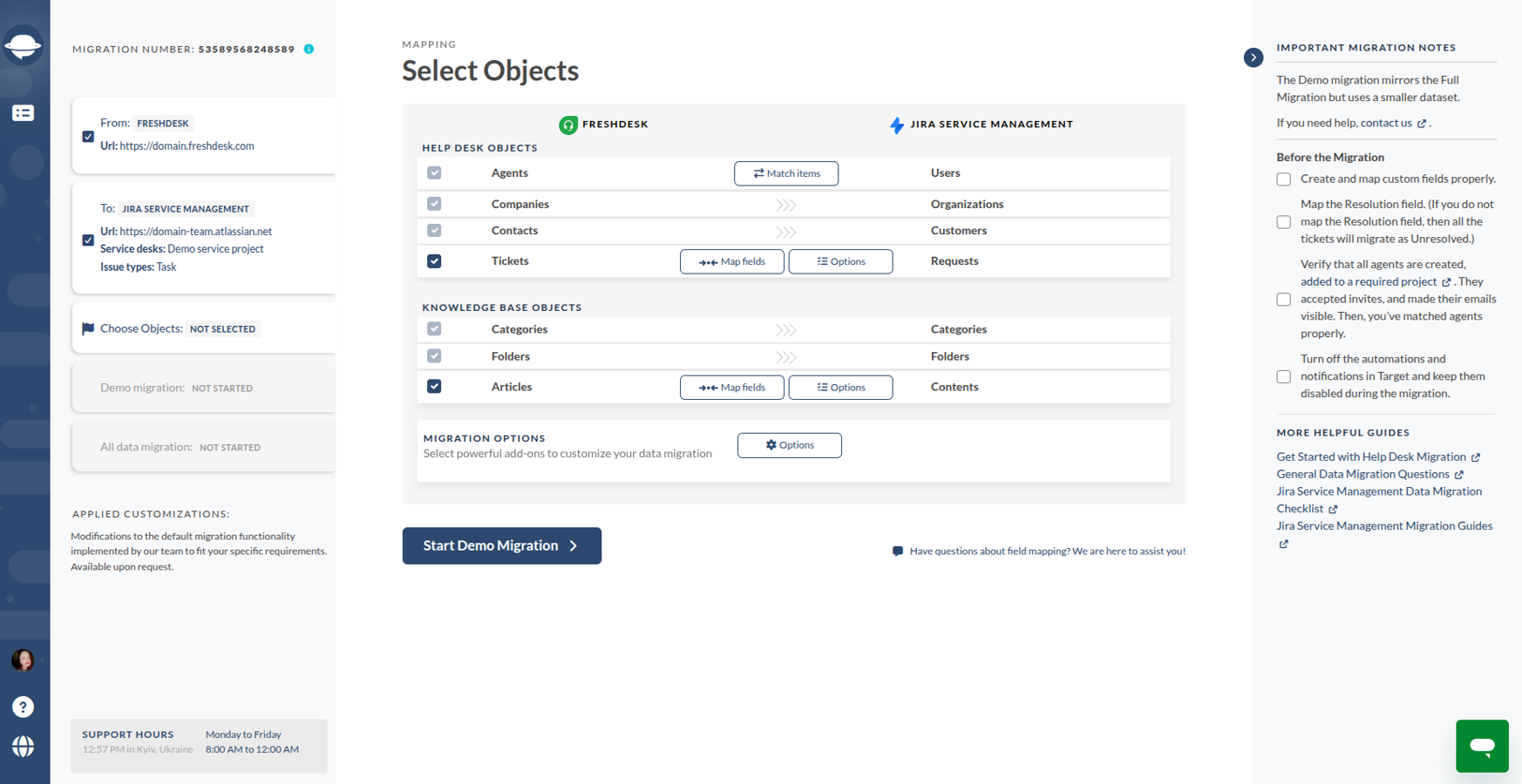 Try the Help Desk Migration app to see how your Freshdesk your data will appear in Jira Service Management. Map fields, tickets, and related data before migrating. Move from Freshdesk to Jira 20 samples with a Free Demo.