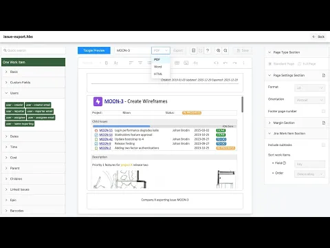 Export every work item field to stylish PDF, Word, HTML documents. Best-in-class editor with the powerful {{handlebars}} template language. Drag & drop, rich styling, images, header, footer, logic... and toggle preview.