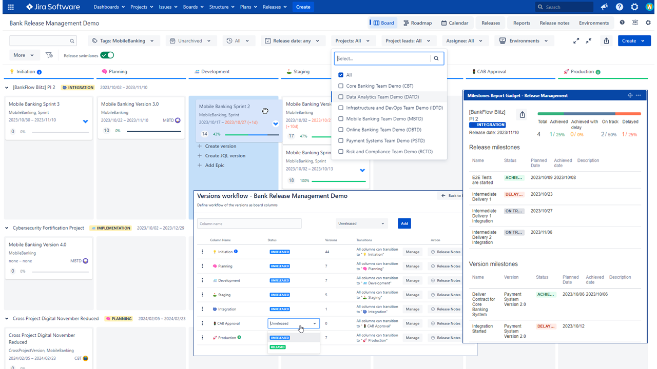 Manage cross-project releases, Versions, Epics, or JQL-based releases. Track dependencies between component releases and package them into meta releases for complex systems or business initiatives.
