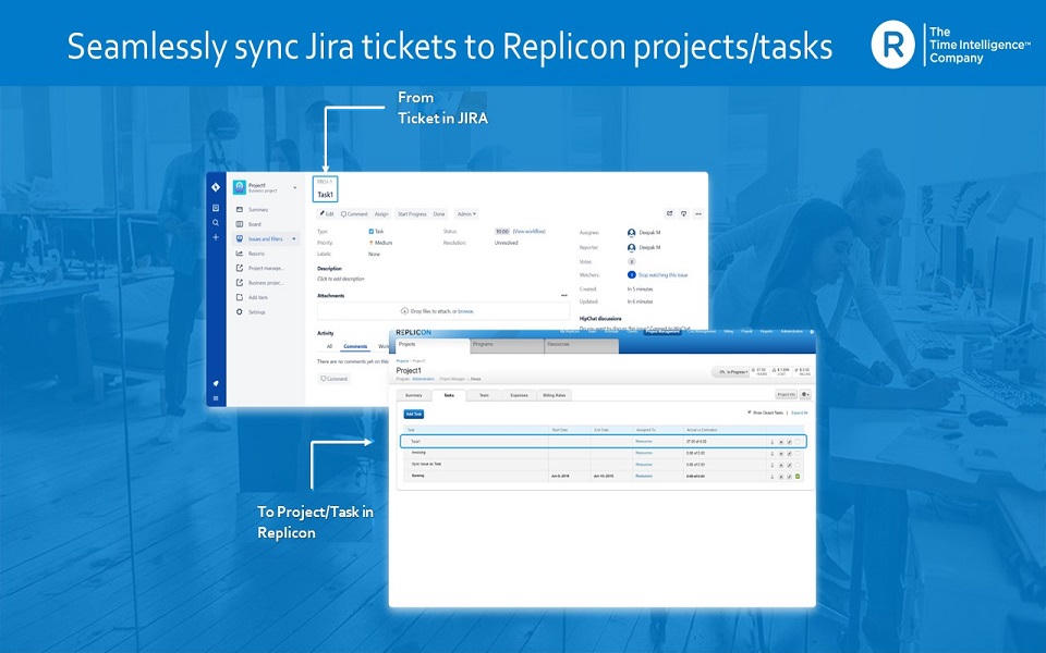 - Transfer of projects and issues from Jira to Replicon, so you can use Replicon to plan work, track progress, and bill clients