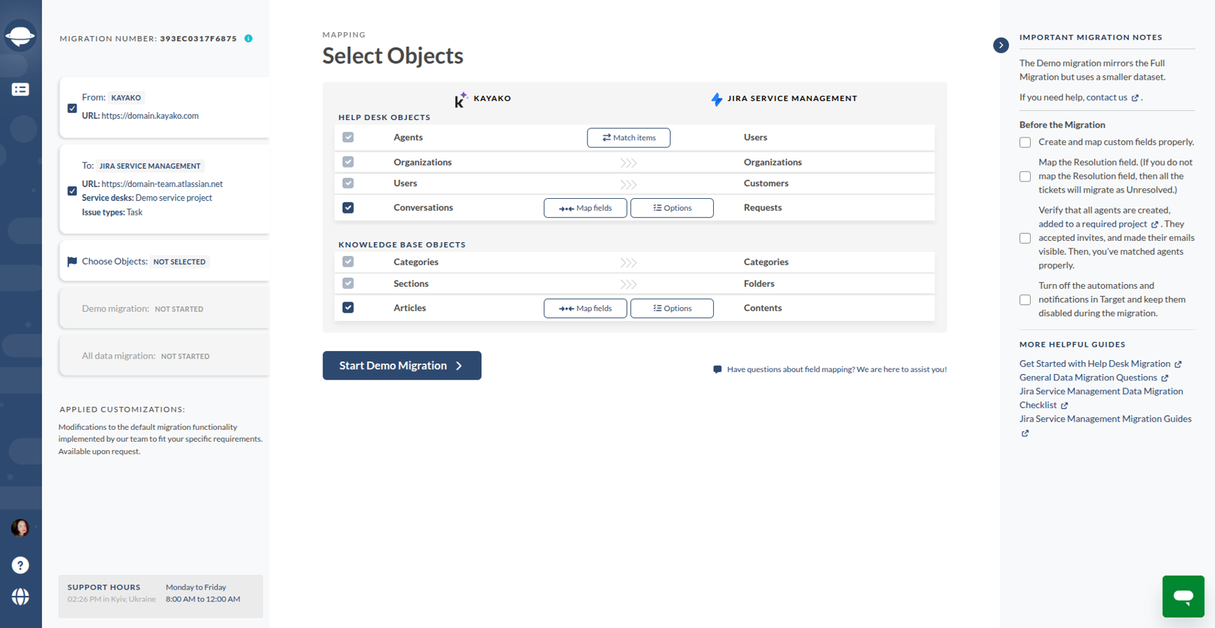 Start your migration journey with full confidence. Migrate up to 20 tickets from Kayako to Jira Service Management. Perfect every detail of your migration, completely free.