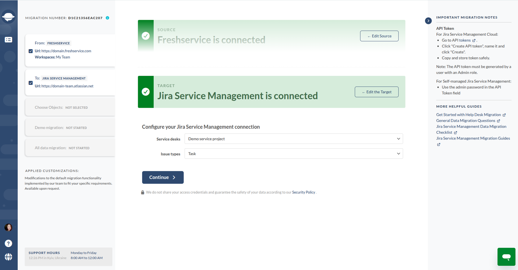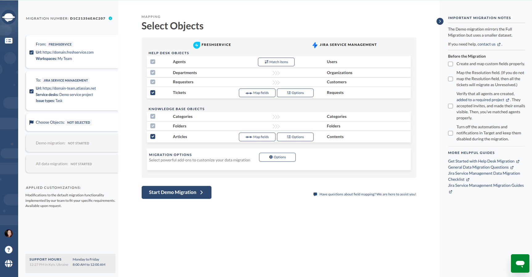Free Demo Migration lets you test the transfer from Freshservice to Jira in a few minutes. To ensure a successful Freshservice import tickets process, you can set up the migration of 20 tickets and re-run the Demo.