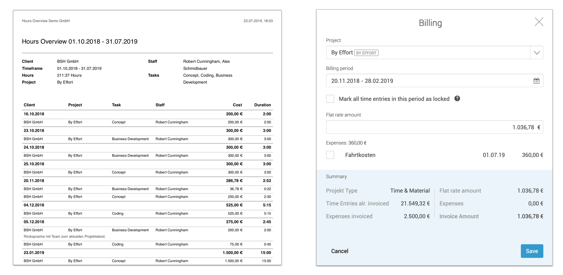 Export the working hours of your team as PDF, Excel or CSV and automatically create invoices for your customers.
