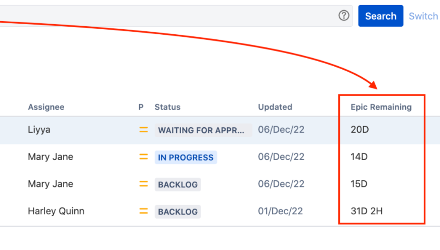 - Find epics with Epic Estimate is greater than Epic Time spent