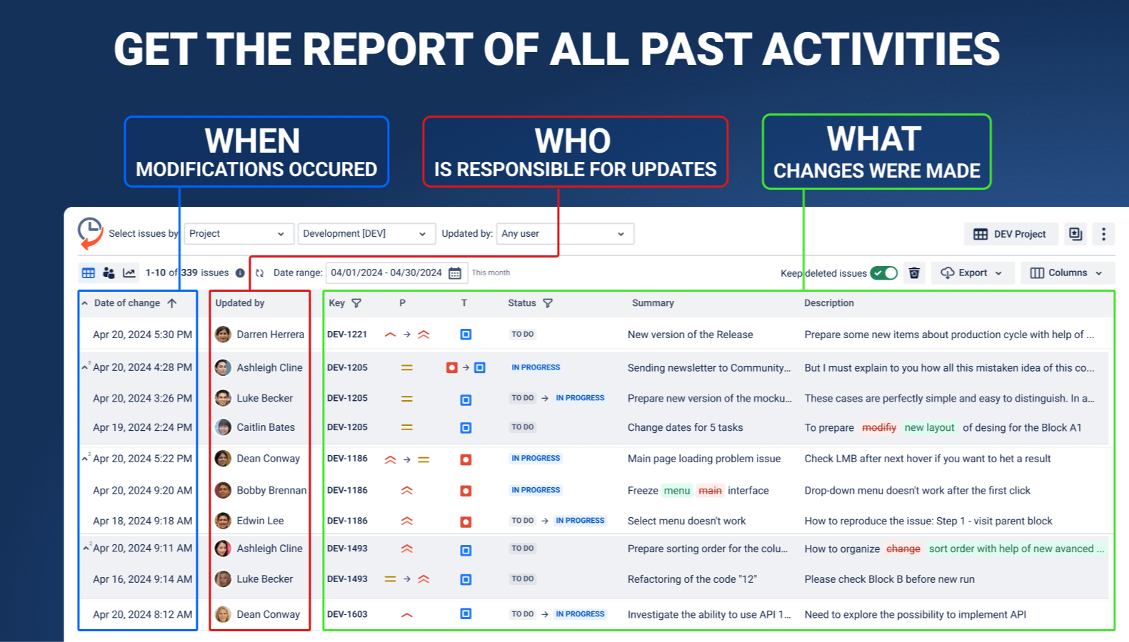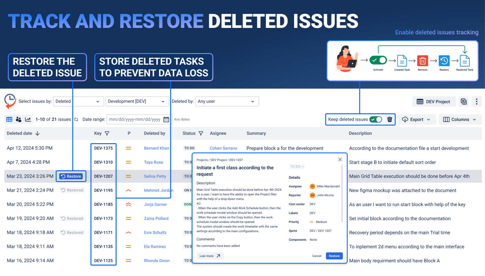 Key highlights of the app๐ Create custom issue history reports, audit user activity, export history in Excel and CSV. Track and restore deleted issues