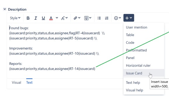 Add visual cards to issue comments, description using tool bar of the visual editor.