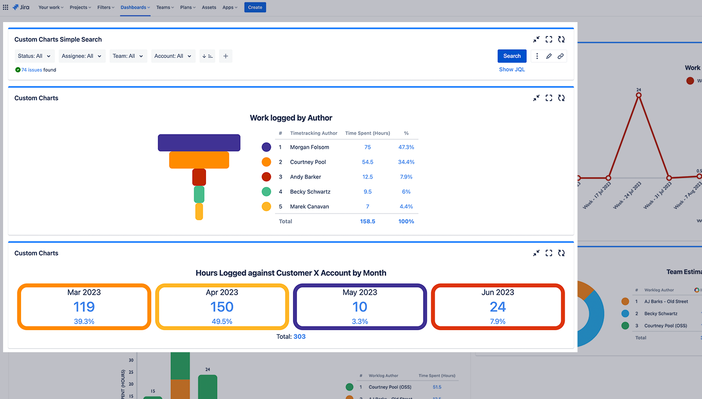 Custom Charts for Jira is a flexible, customizable reporting app that allows you to monitor work progress & identify roadblocks. With a few keystrokes, you can build custom charts to evaluate crucial project metrics & add them to your Jira dashboard, streamlining the reporting process.