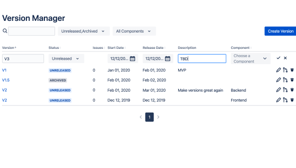 See all available versions in one editable table. Filter by name, status, or component, and easily create, edit, delete, or merge versions.
