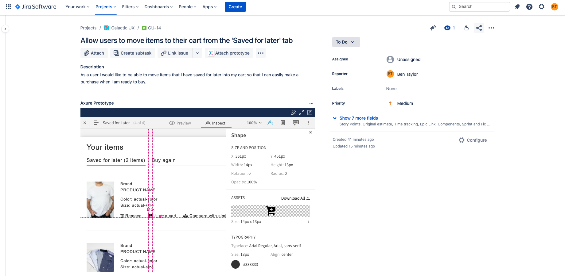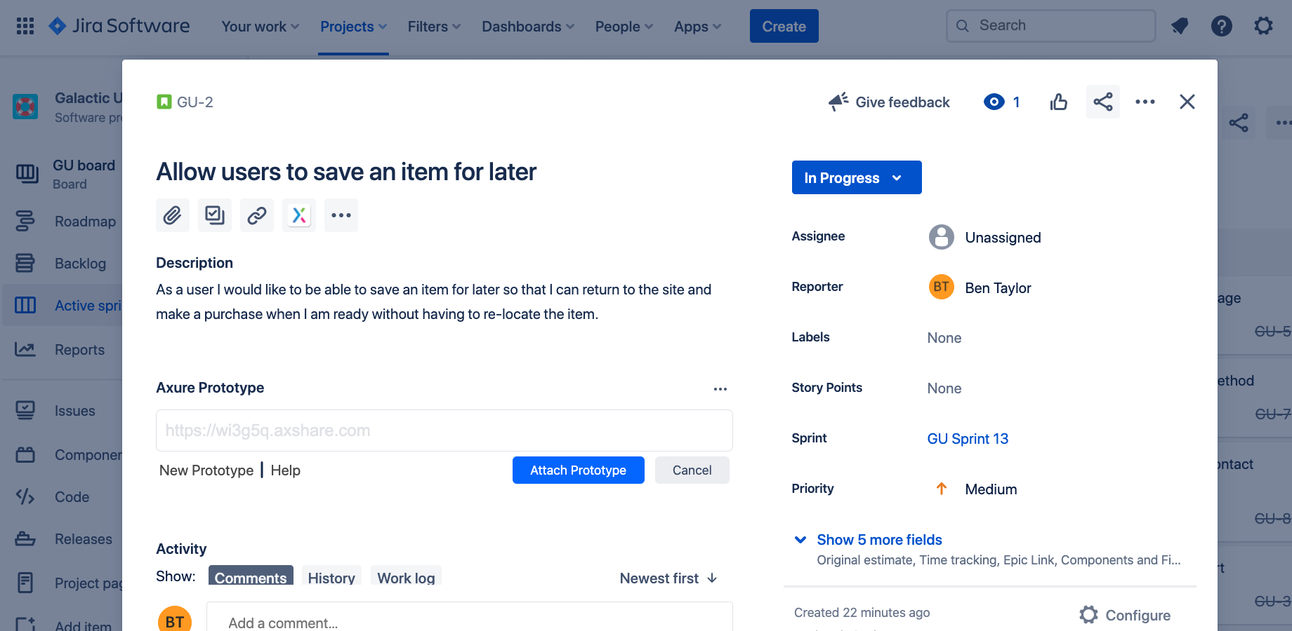 - From within a Jira ticket, click the Axure icon and paste the link into the Axure Prototype field