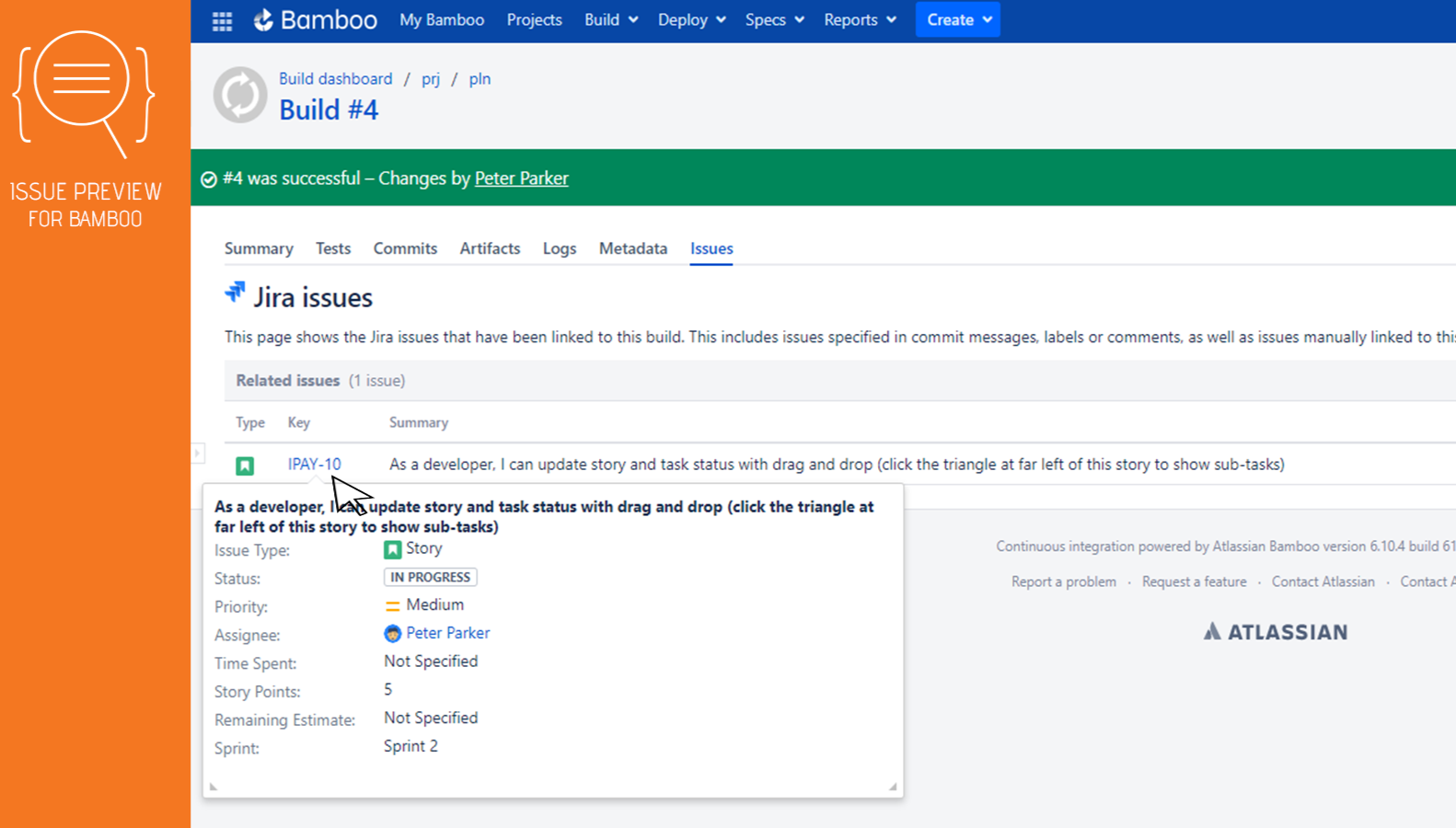 - Preview enabled in build plan Issues tab and in each build plan run Summary, Commits and Issues tabs