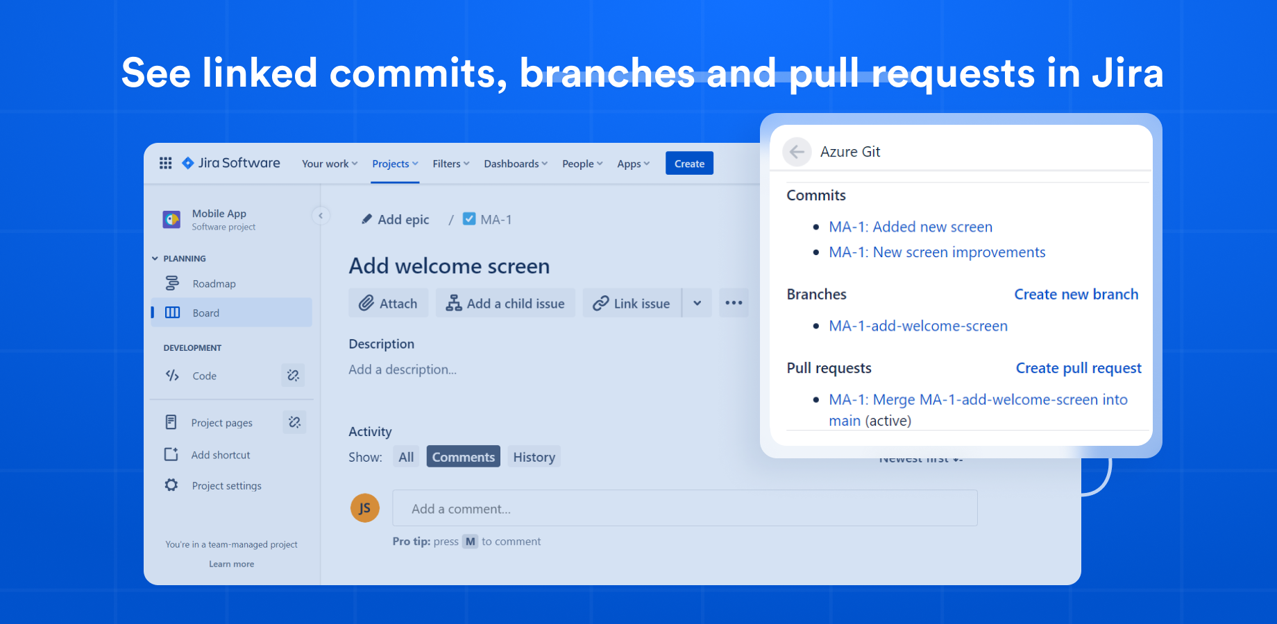 Include Jira issues in your commit messages, push your changes to Azure Git, and see the linked changes right on your Jira issue page.