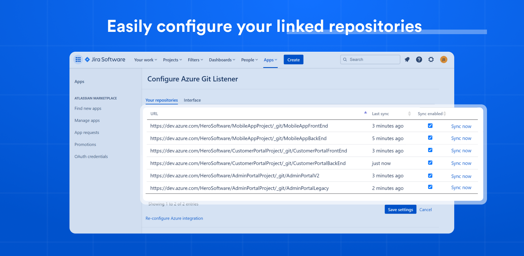 Link your Azure organization to Jira in a single click, and choose which repositories you would like to sync. You can connect to Cloud or On-Premise installations of Azure DevOps.