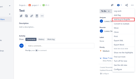 Save a Jira issue as a Bug in Bugzilla