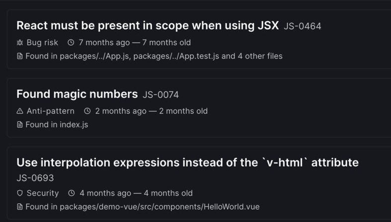 DeepSource static analyzers goes beyond detecting surface level issues and are optimized to show you only the relevant results and no noise.