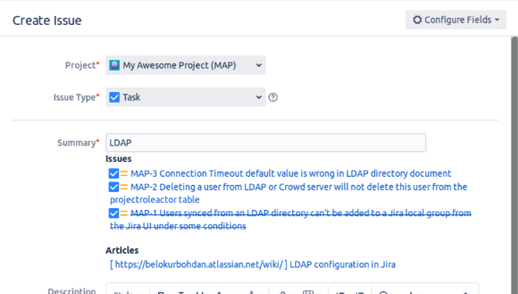 This plugin allows you to see existing issues and articles when you try to create new issue. Also you can set additional Text custom field on your screen for search relevant items.