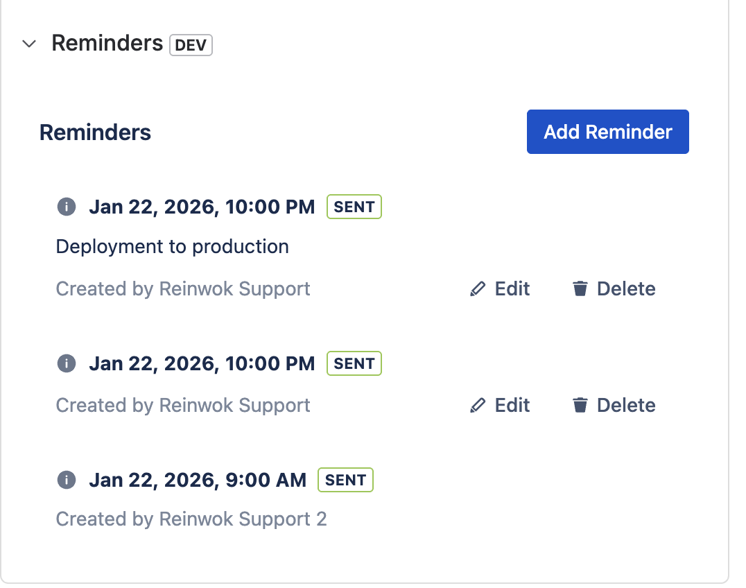 View reminders on 'Issue' or 'My Reminders' pages. With the right permissions, you can edit or delete them.