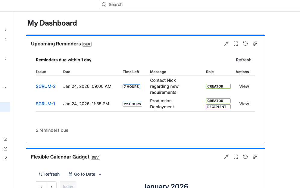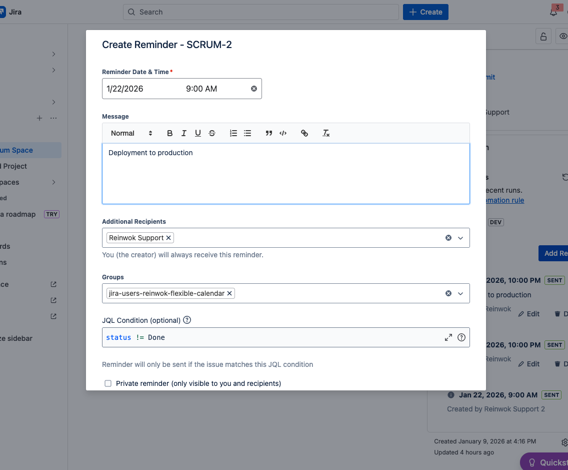 - Jira Administrators can configure reminder permissions from a centralized admin page — including disabling group/user recipients and restricting which groups can create or view reminders.