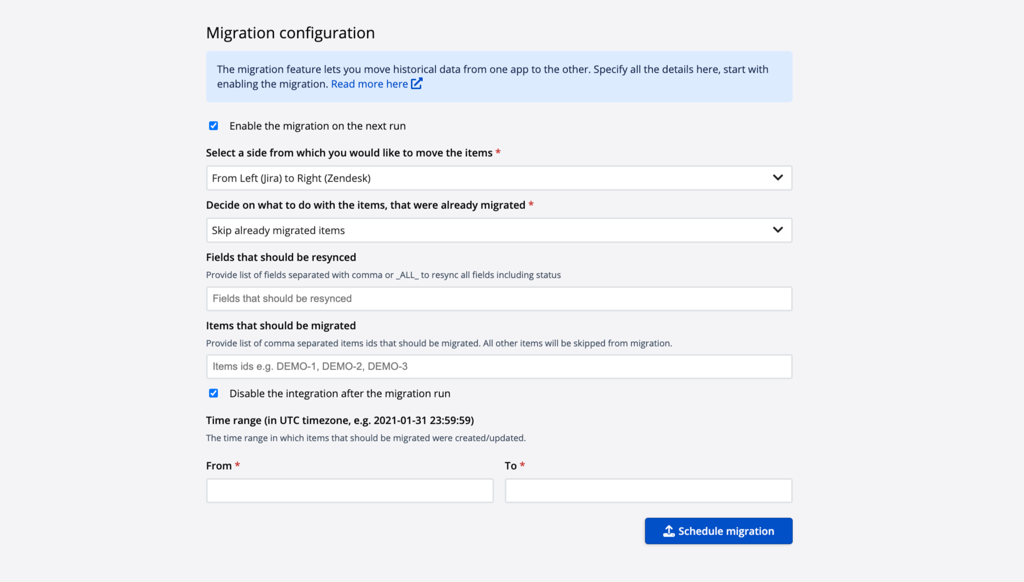 Use Jira and Zendesk migration to sync work items, tasks with attachments, custom fields, and comments. Get Onboarding with migration expertise. Migration is a premium feature - reach out to us to learn more.