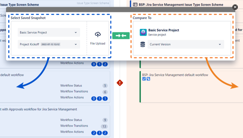 Create snapshots as Jira configuration milestones. Find configuration changes in projects by time. Download and upload to different instances when moving from dev to prod or validating cloud migration.