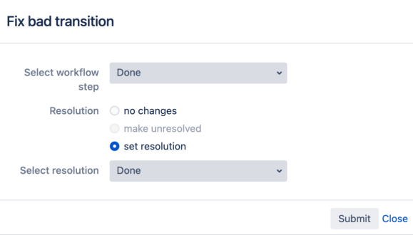 With the add-on Jira administrators are able to transit any issue in any project to any workflow status: