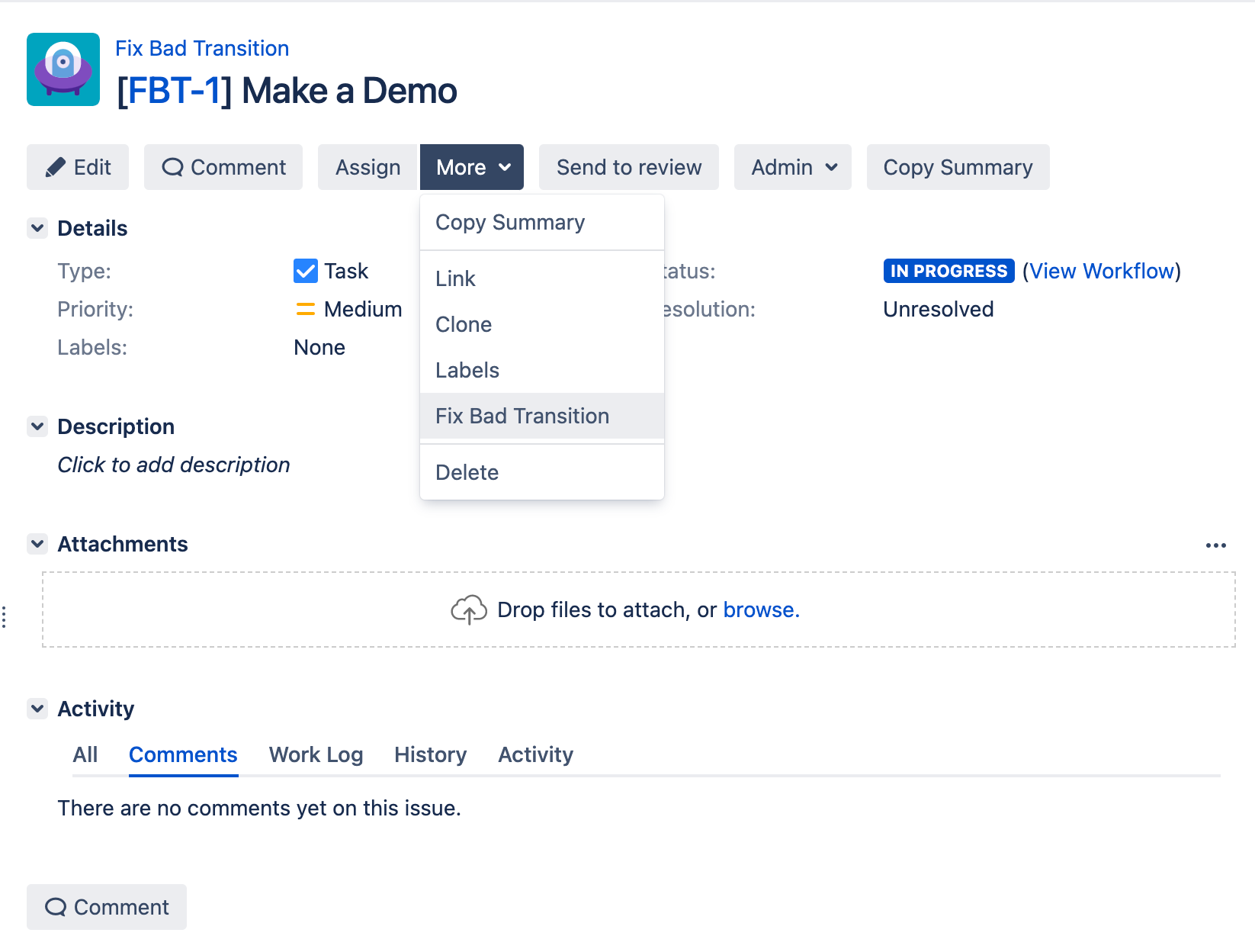 'Fix bad transition' action is available in 'More'[ sub-menu on issue view screen