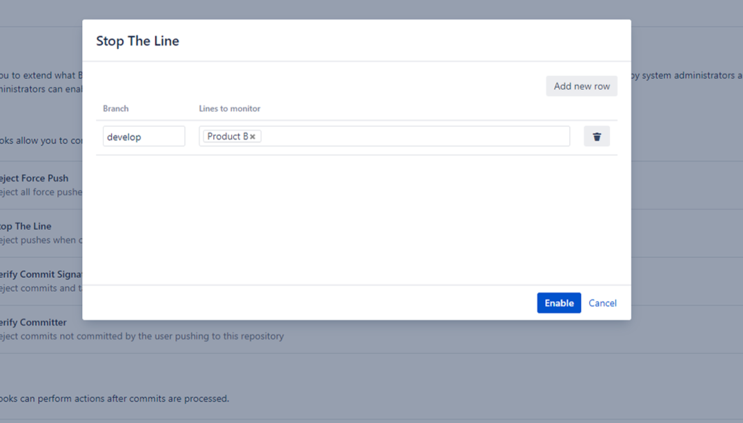 - One project/repository can be configured to follow more than one line. If at least one of the lines is stopped, pushed are blocked