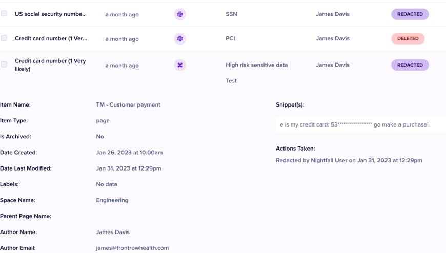 Nightfall is the easiest-to-use and most accurate data leak prevention (DLP) platform for SaaS & cloud apps, powered by machine learning. Integrate in minutes with any Confluence Cloud plan. For Data Center/Server, see here. Save time with real-time alerts, automated remediation actions, and pre-built detection templates to ensure you spend less time managing security alerts.