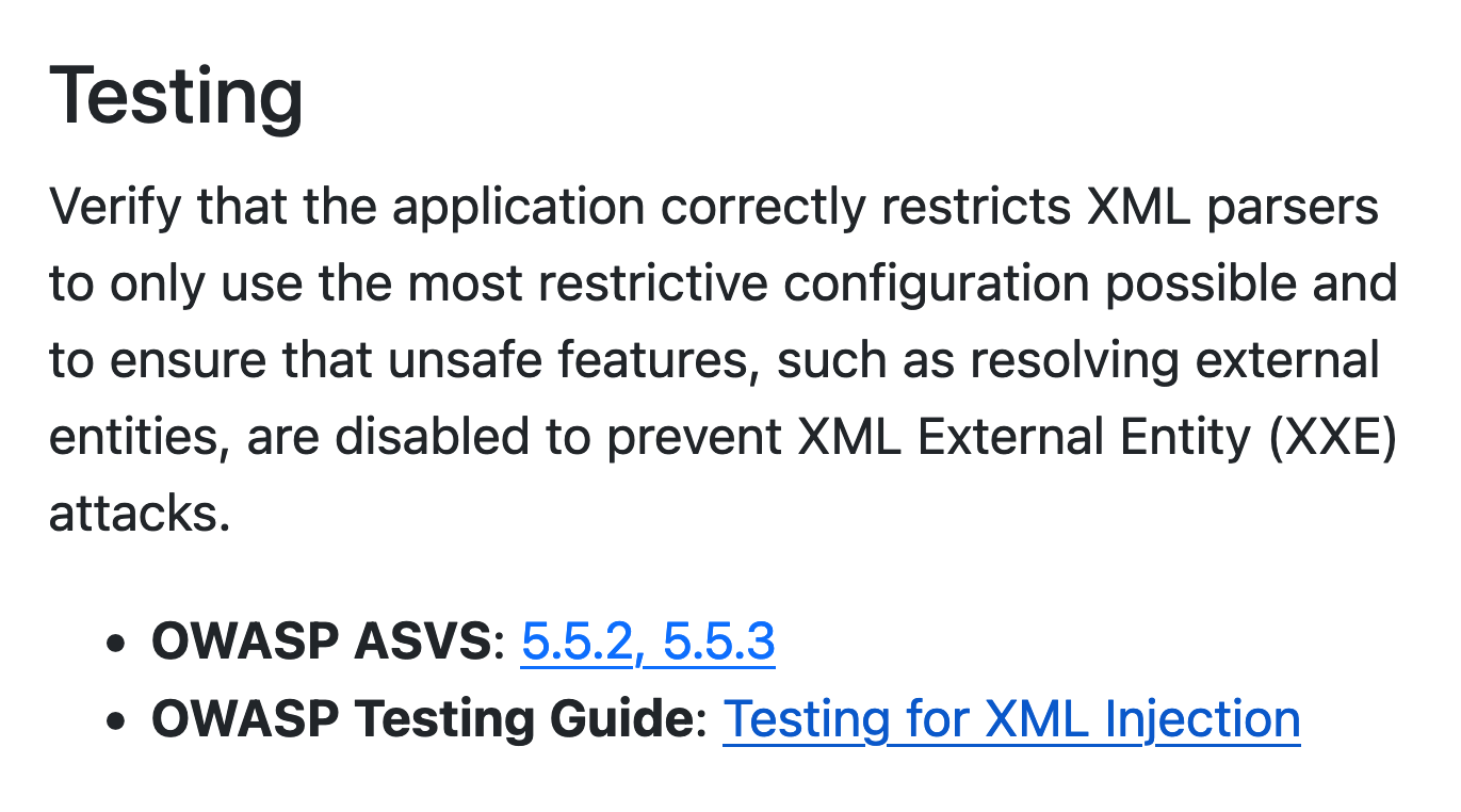 Testing advice linked directly to the OWASP Application Security Verification Standard.