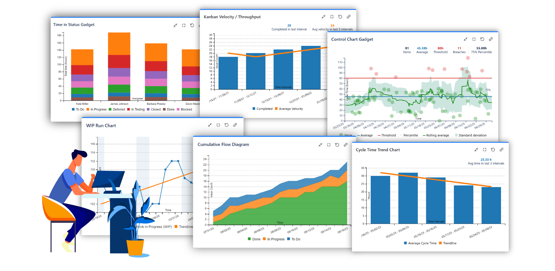 Kanban or Lean projects? Customer Support or Service Desk teams, ITSM in JSM? Track essential metrics and charts like control chart, cumulative flow diagram, throughput, cycle time or lead time trend, WIP aging and more.