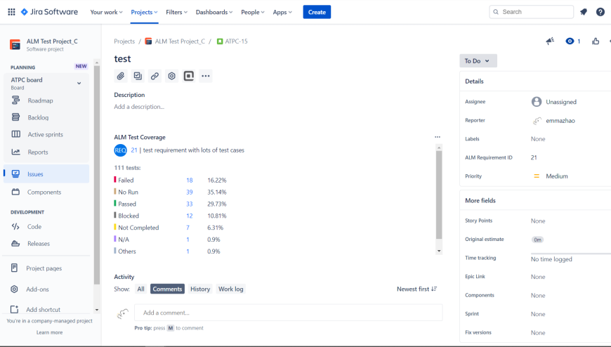 The ALM -Test Management for Jira plugin provides Jira users with test coverage and status information directly on native Jira epics, stories, issues, or custom types.